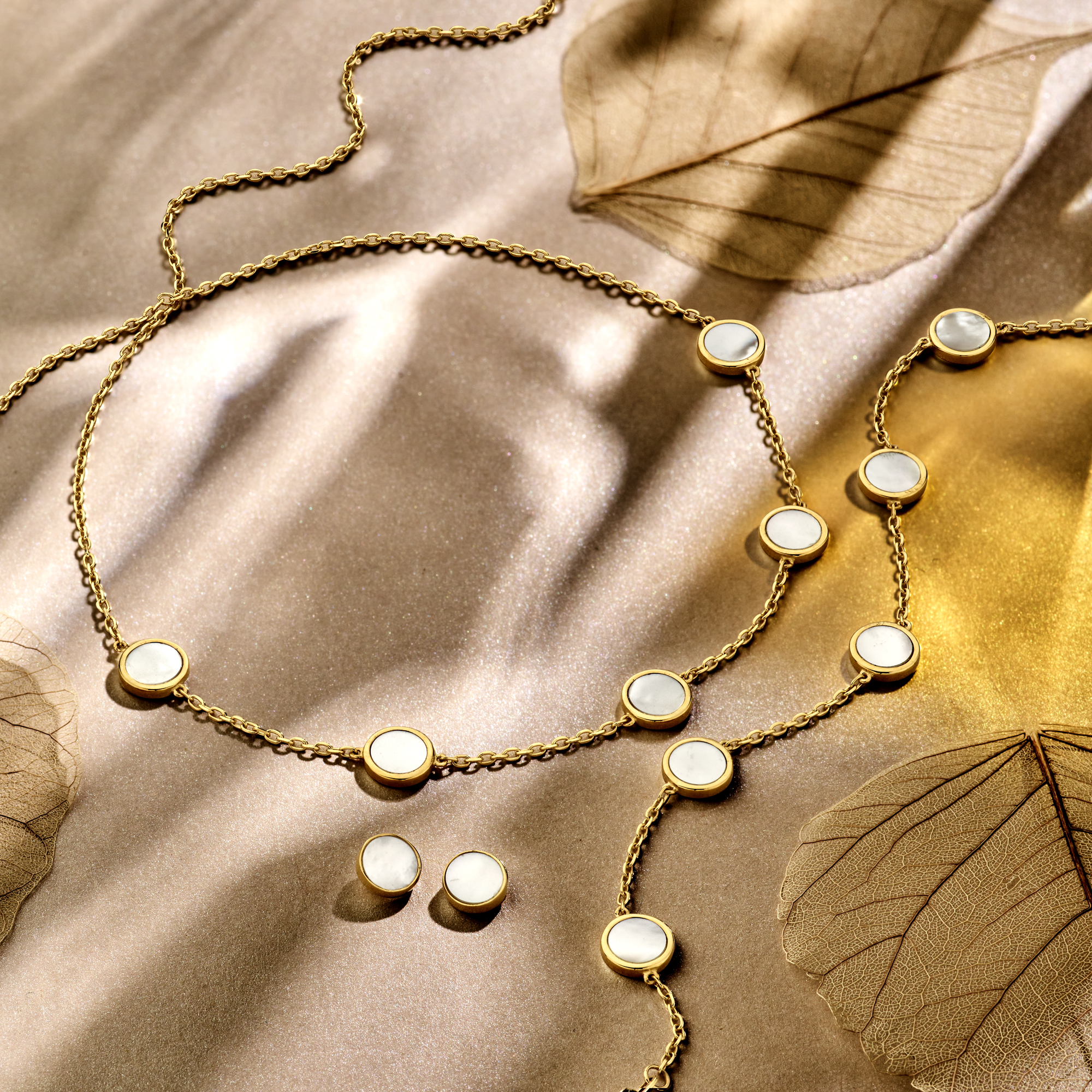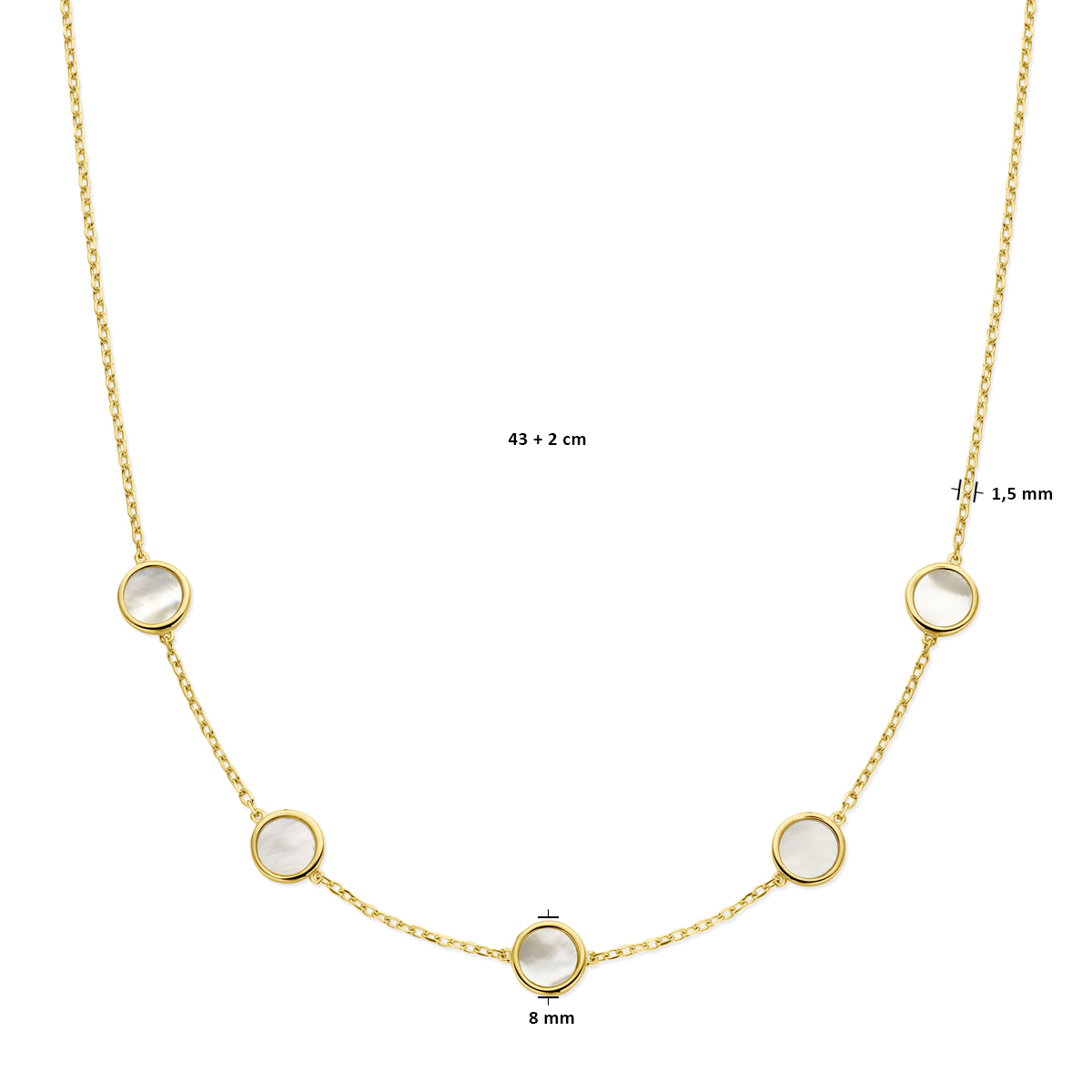 14k Geelgouden collier uitgevoerd met parelmoer. Het collier heeft een schakelbreedte van 1,5mm, een draaglengte van 43cm en een extensie van 2cm. Uitgevoerd met karabijnslot.