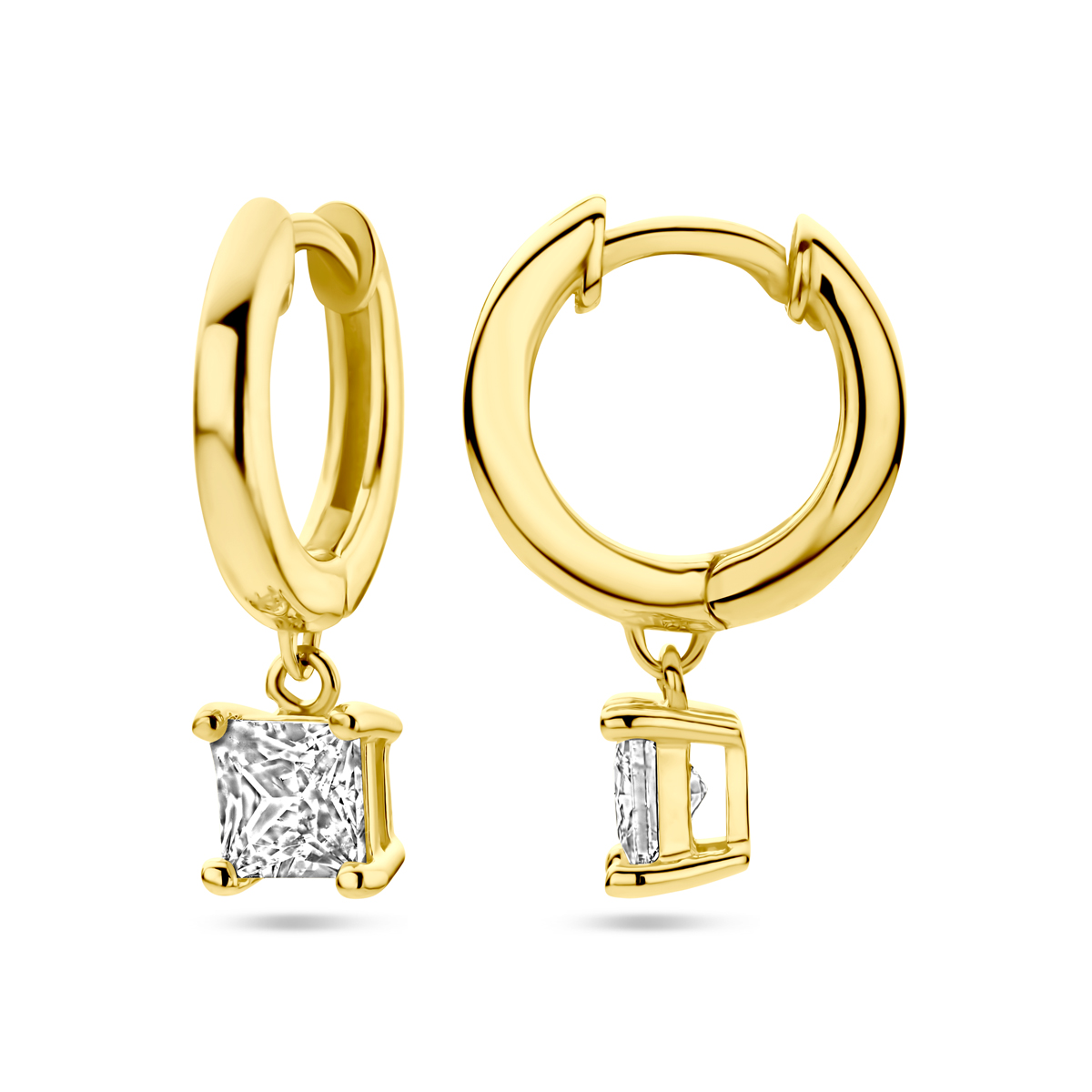 14k Geelgouden klapoorringen uitgevoerd met zirkonia. De oorringen hebben een totale hoogte van 18mm.