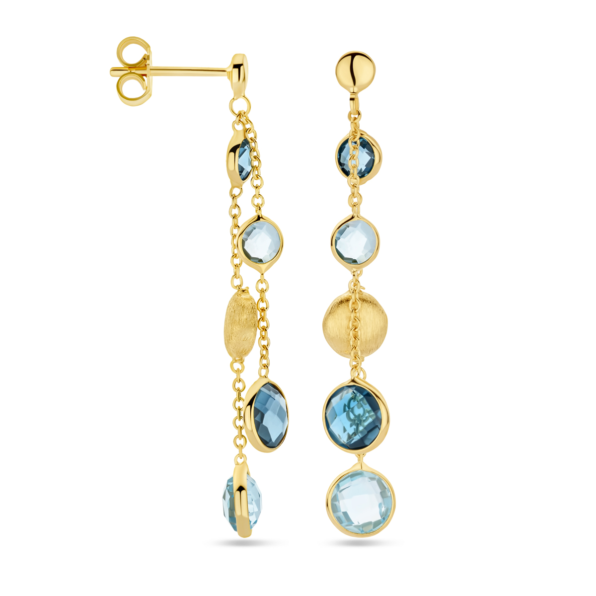 14k Geelgouden oorhangers uitgevoerd met rondjes, sky blue topaas en london topaas. De oorhangers hebben een totale hoogte van 44mm