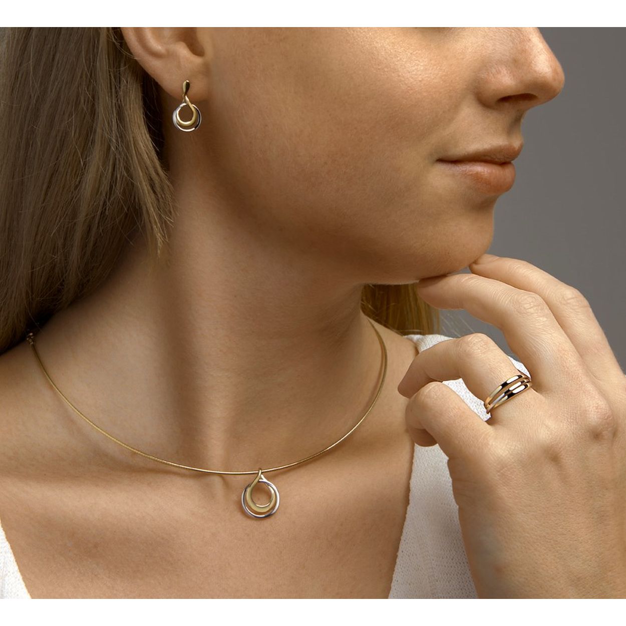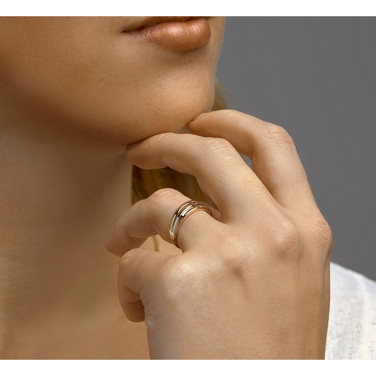 14k Bicolor geel- en witgouden ring. De ring heeft een breedte van 6mm.