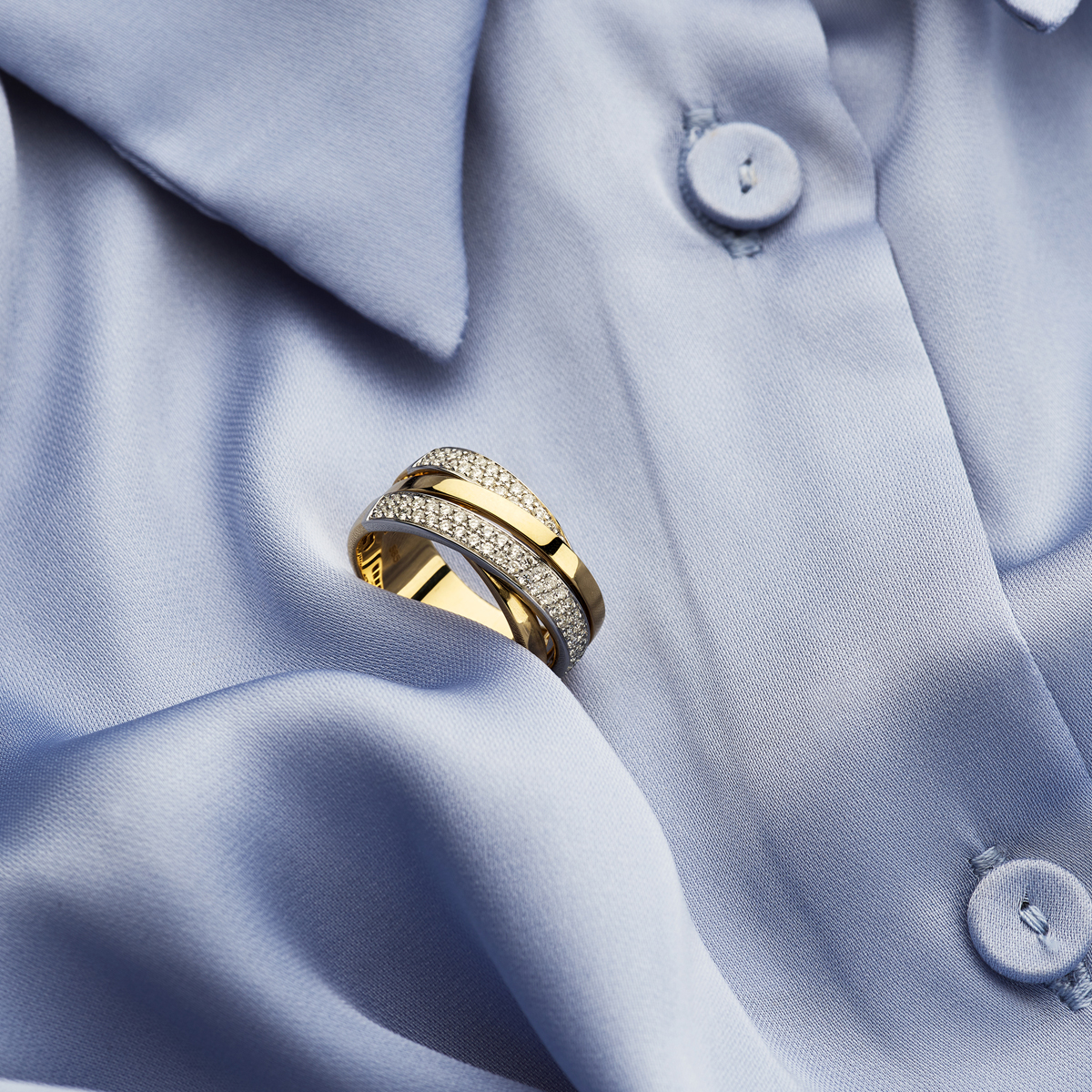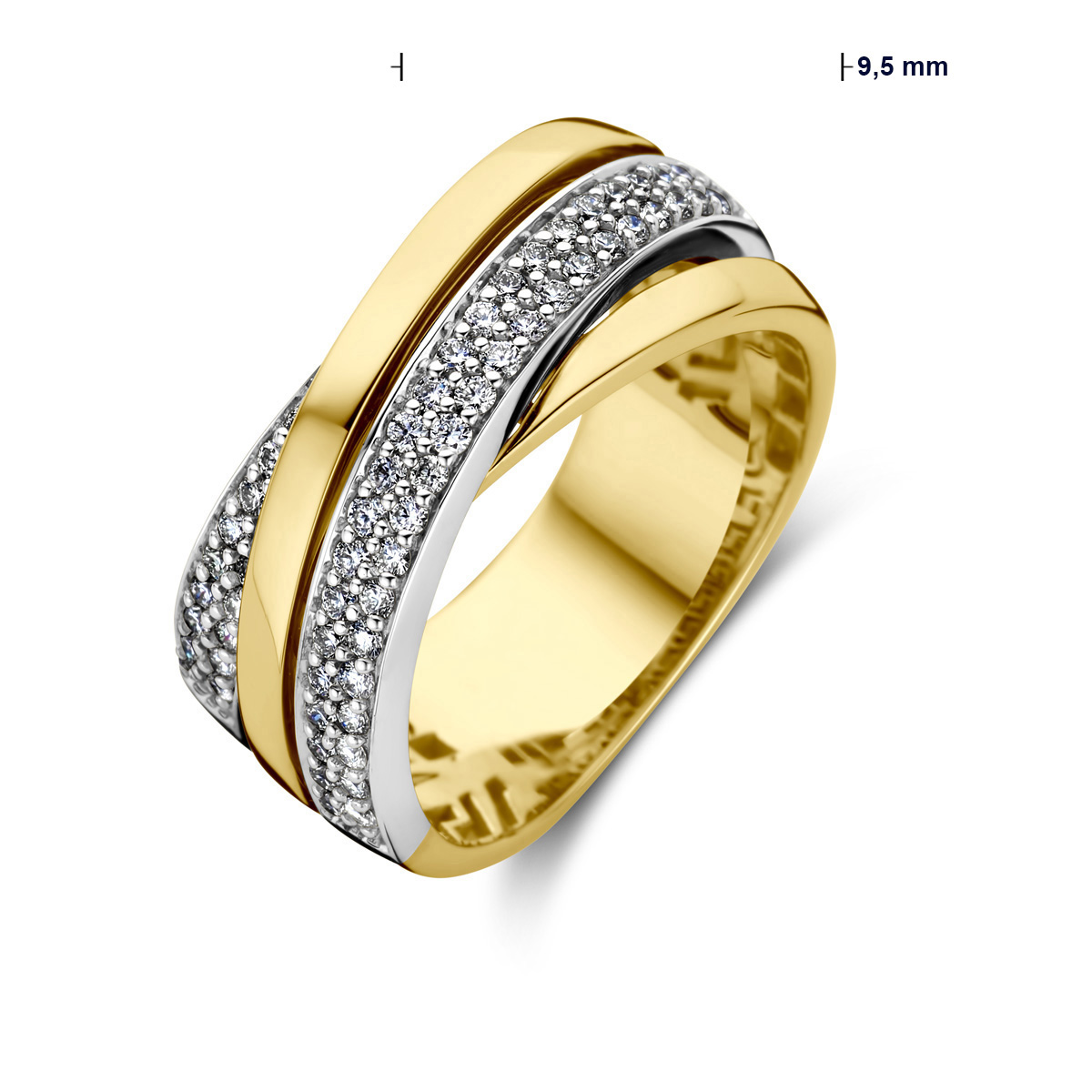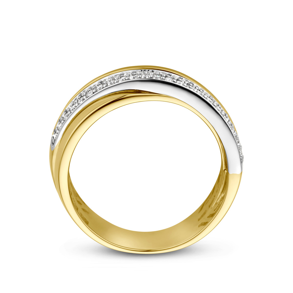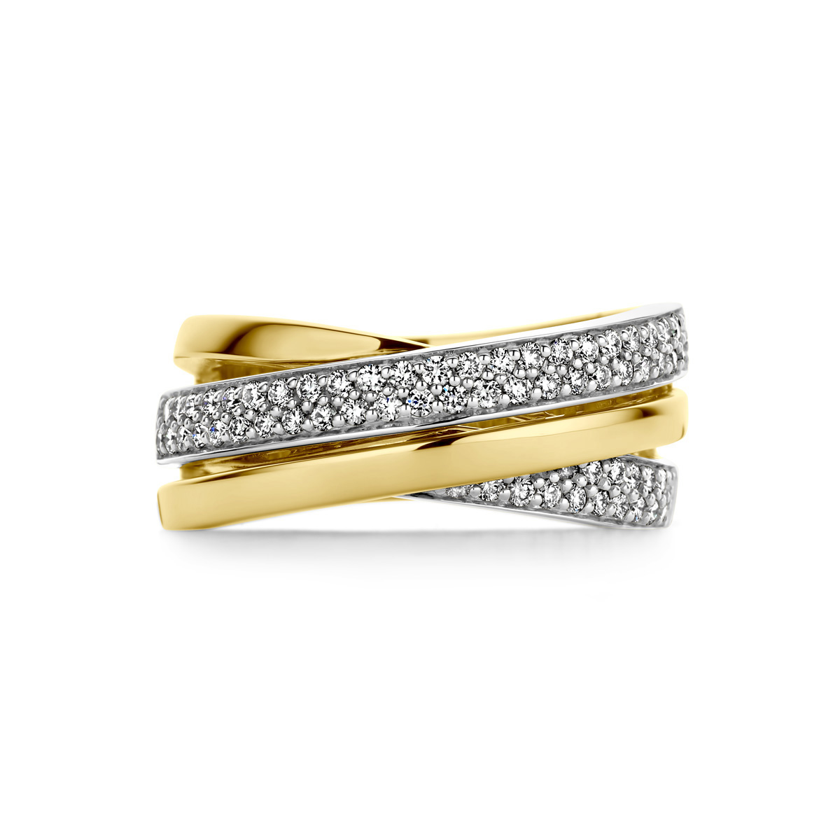 14 k Stijlvolle bicolor geel- en witgouden ring met 4 schitterende briljant geslepen diamant rijen.